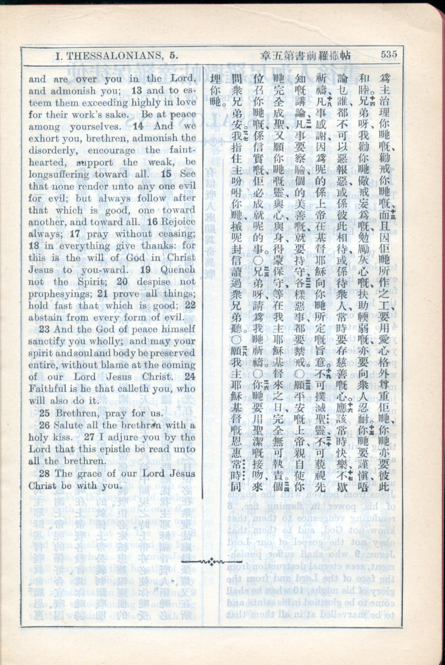 1931年新约全书广东话新译本与美国新译英文 帖撒罗尼迦前书 5 章 13 节到 5 章 28 节