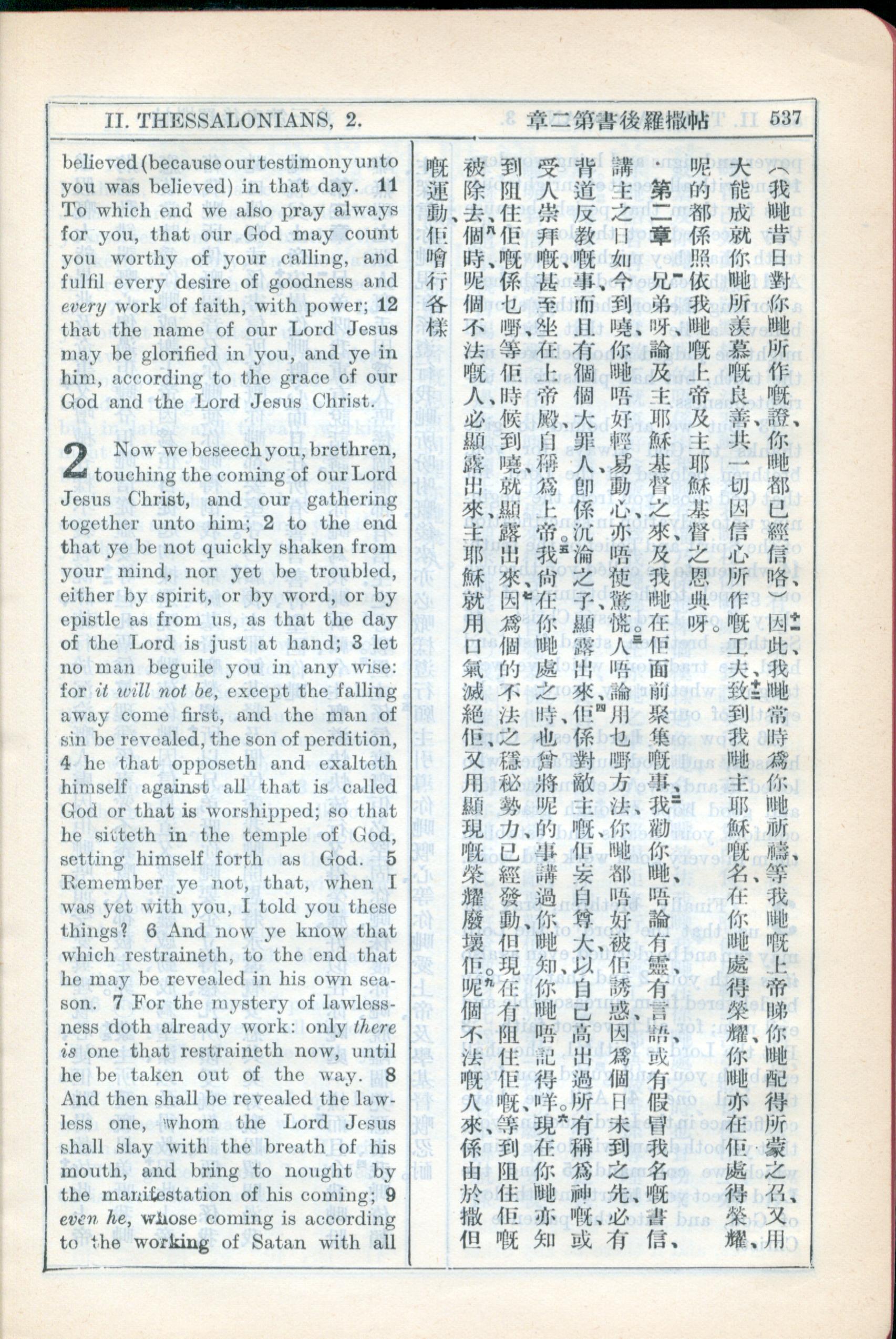 1931年新约全书广东话新译本与美国新译英文 帖撒罗尼迦后书 1 章 11 节到 2 章 9 节