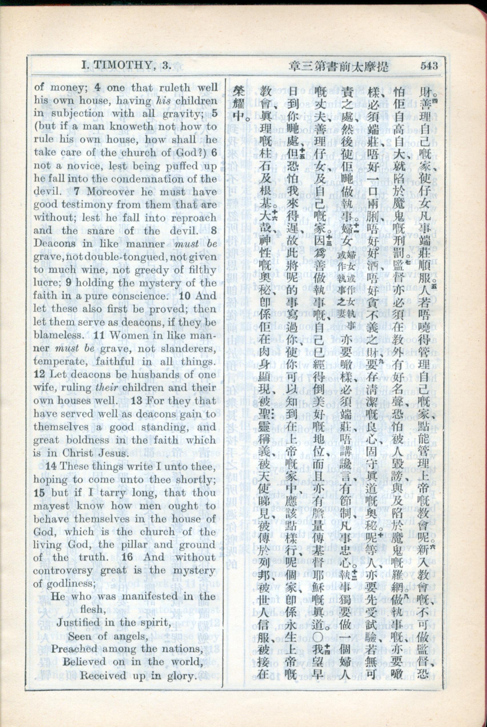 1931年新约全书广东话新译本与美国新译英文 提摩太前书 3 章 4 节到 3 章 16 节
