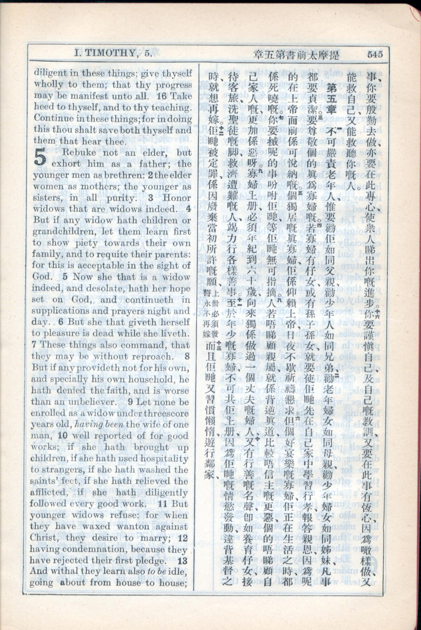 1931年新约全书广东话新译本与美国新译英文 提摩太前书 4 章 15 节到 5 章 13 节