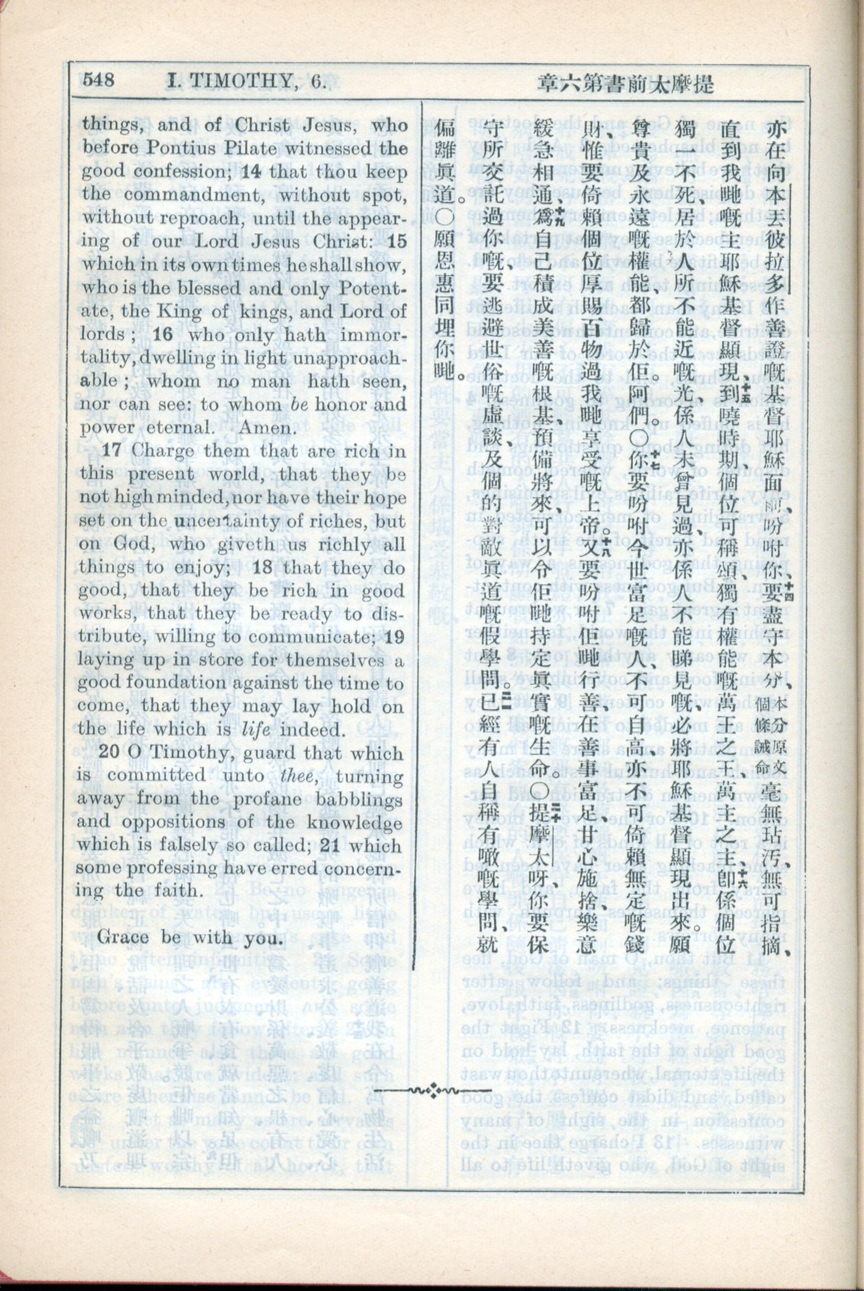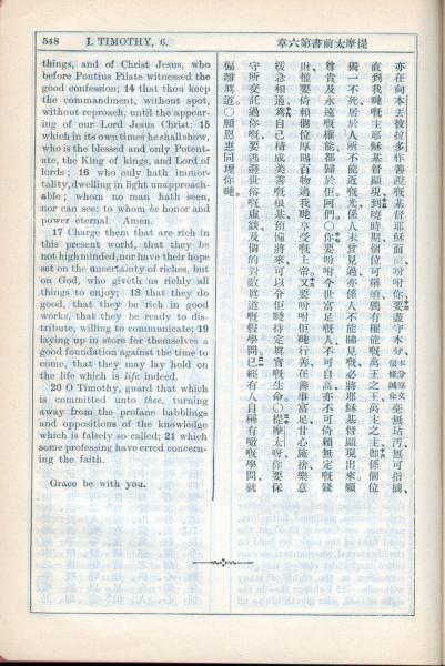 1931年新约全书广东话新译本与美国新译英文 提摩太前书 6 章 14 节到 6 章 21 节