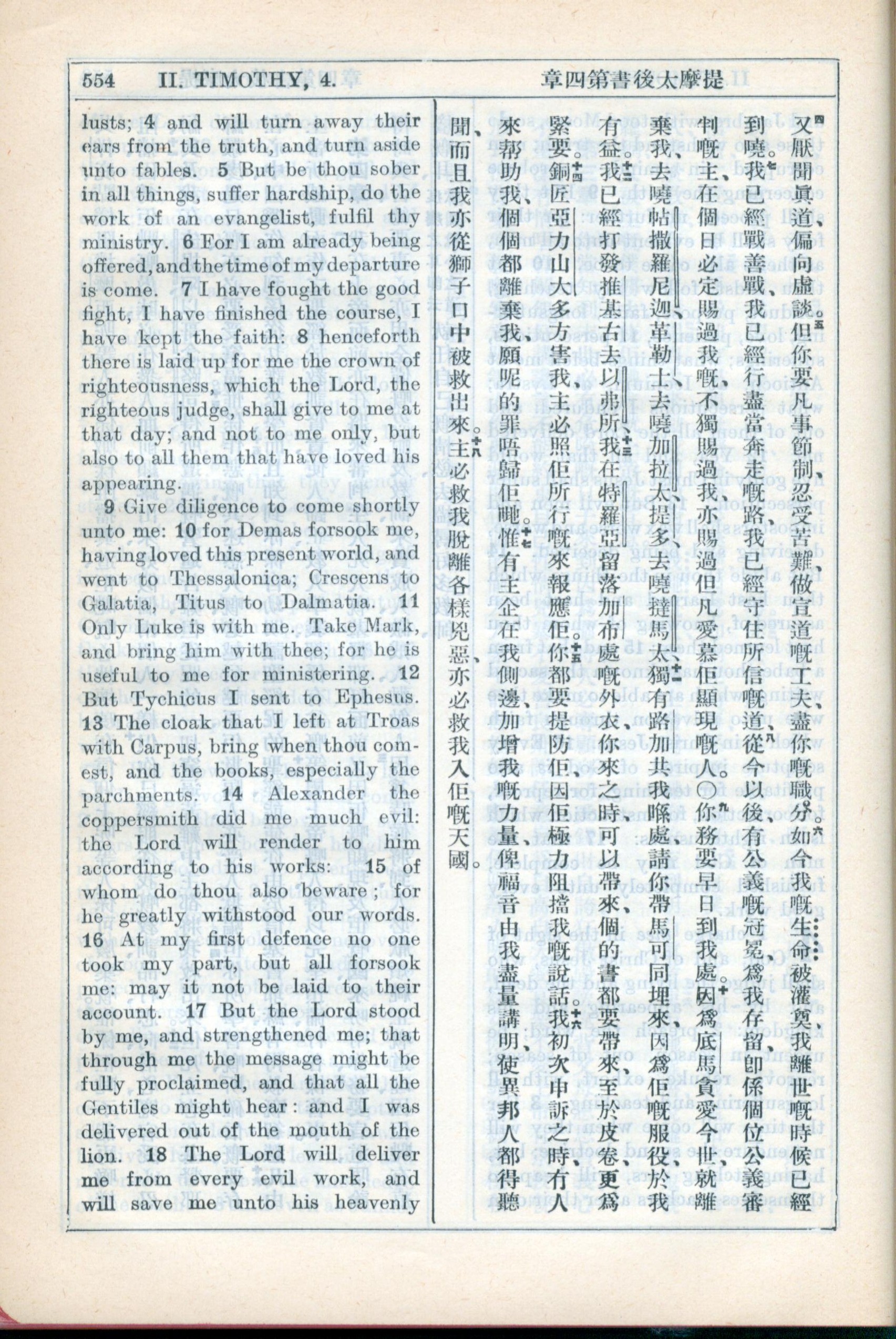 1931年新约全书广东话新译本与美国新译英文 提摩太后书 4 章 4 节到 4 章 18 节