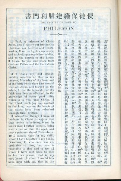 1931年新约全书广东话新译本与美国新译英文 腓利门书 1 章 1 节到 1 章 13 节