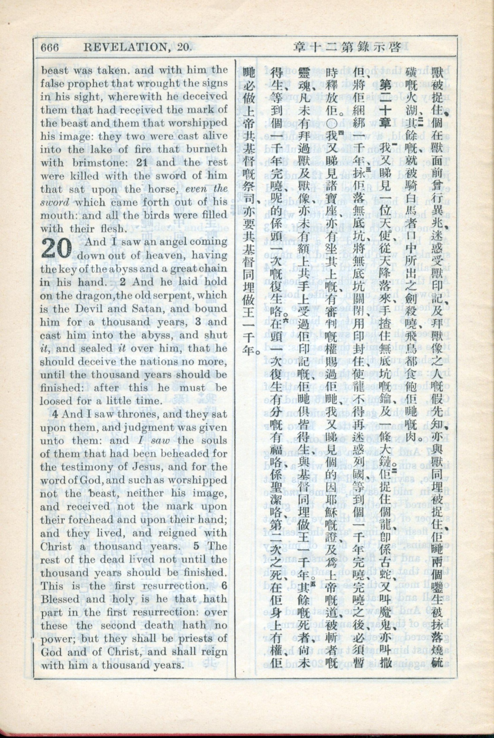 1931年新约全书广东话新译本与美国新译英文 启示录 19 章 20 节到 20 章 6 节