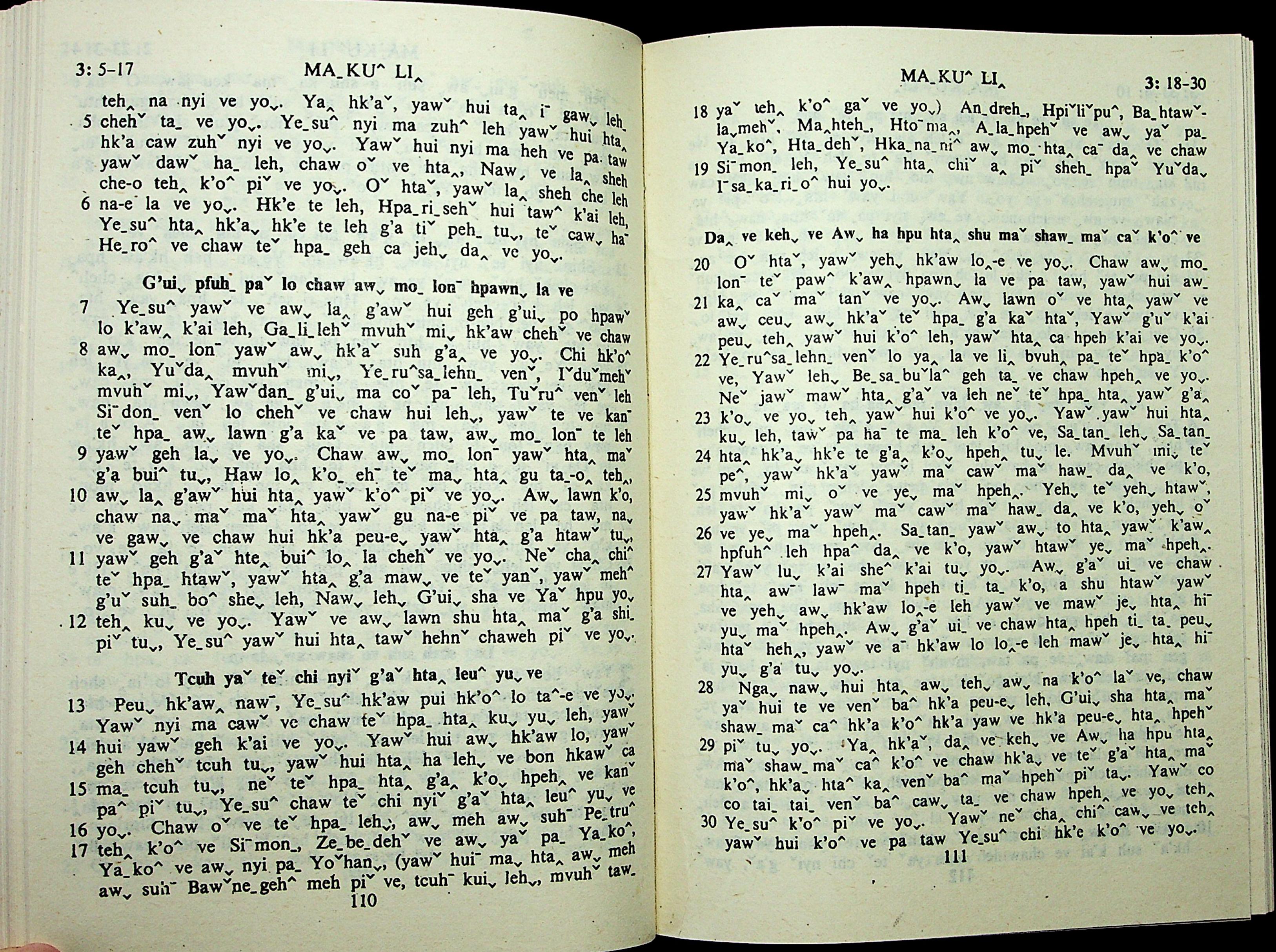 1985年拉祜文新約全書 馬可福音 3 章 5 節到 3 章 30 節