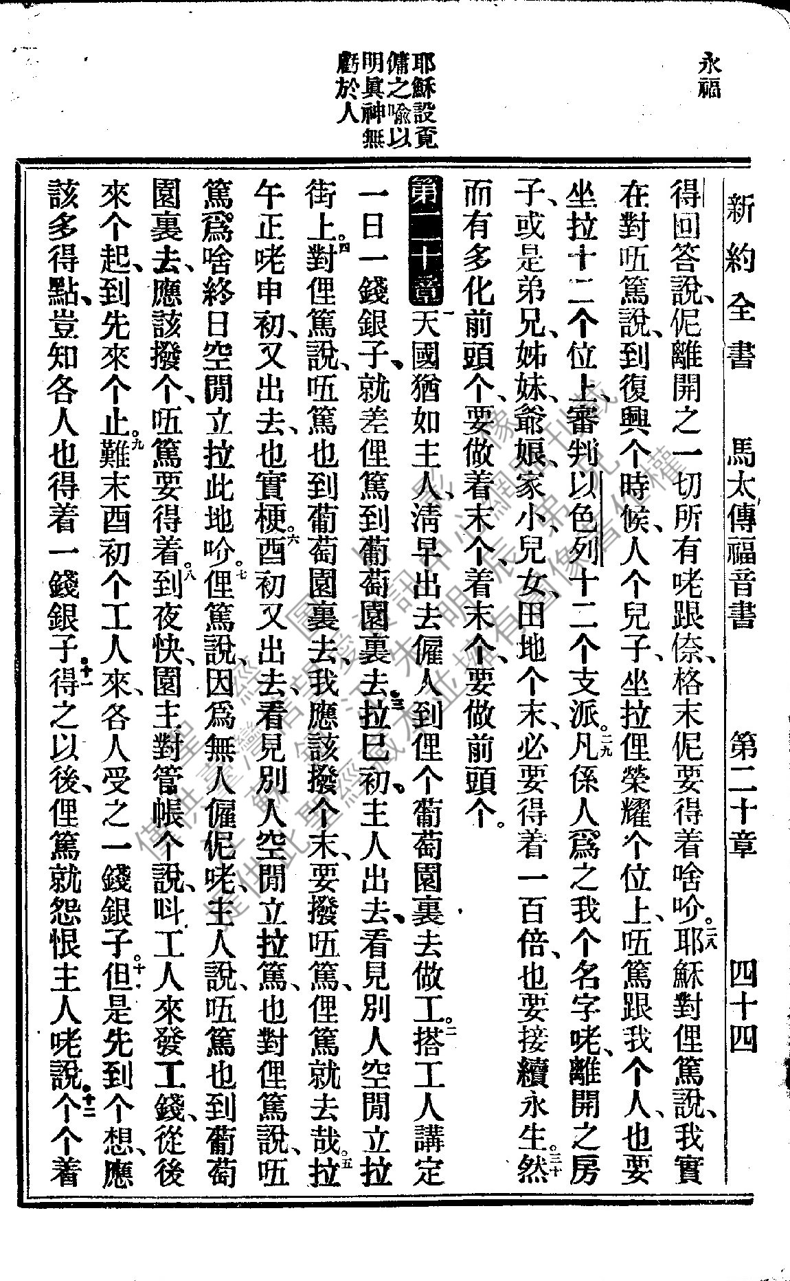 1922年新約全書 馬太福音 19 章 28 節到 20 章 12 節